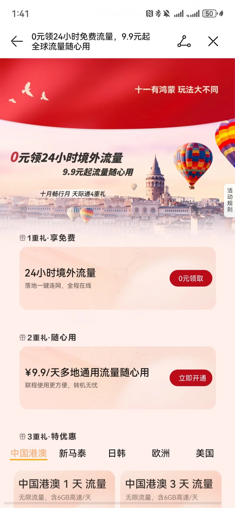 首先,天際通第一重禮·享免費(fèi)——0元領(lǐng)24小時(shí)境外流量。從9月17日至10月31日,華為手機(jī)用戶登錄天際通APP首頁參與活動,即可享受0元領(lǐng)取24小時(shí)境外流量,覆蓋華人出行全球主流目的地,流量領(lǐng)取活動貫穿整個(gè)10月,用戶可在2025年9月28日至2026年3月31日啟用,滿足華為手機(jī)用戶境外出行上網(wǎng)需求,讓用戶零成本體驗(yàn)天際通的高品質(zhì)境外上網(wǎng)服務(wù)。