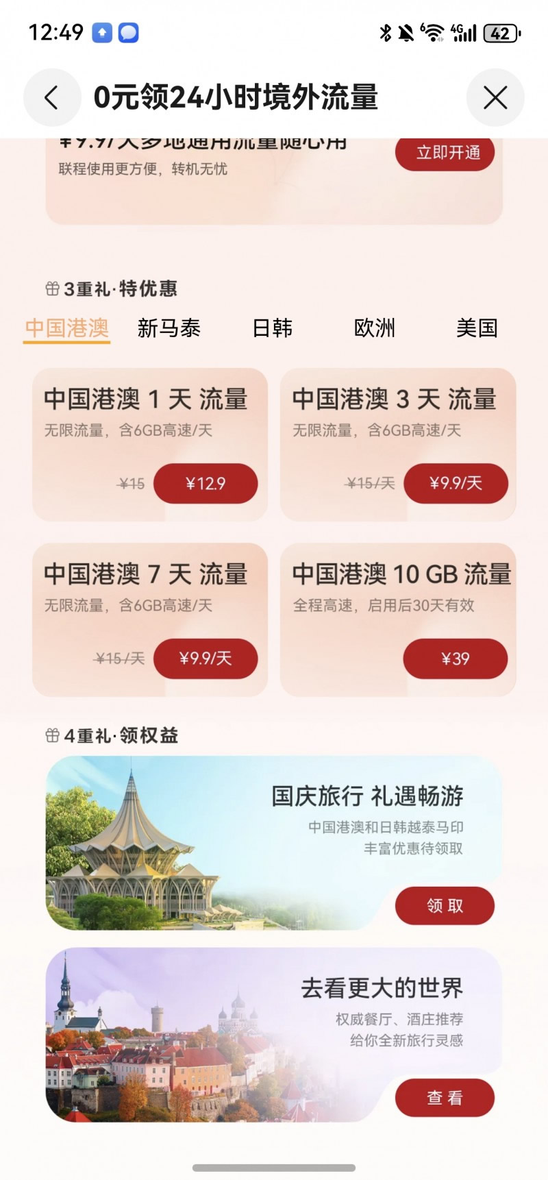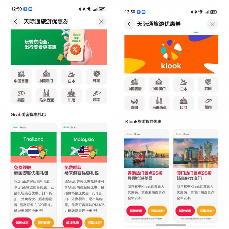 天際通「十月暢行月」第四重禮·領(lǐng)權(quán)益,天際通聯(lián)合全球合作伙伴,為用戶提供超值旅游權(quán)益包,覆蓋Grab打車、Klook景點(diǎn)門票、酒店餐飲等場景,在馬來西亞、泰國、歐洲等地均可享受出境專屬折扣。