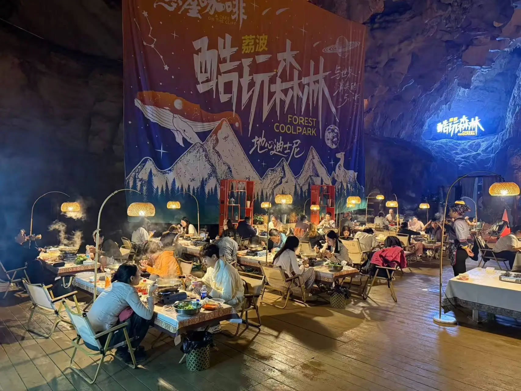 探險之后,在常年保持15攝氏度的洞穴餐廳,吃上一頓熱氣騰騰的火鍋,感受與洞外溫差帶來的獨特體感,成為游客們的特別享受。開闊的洞廳內(nèi),數(shù)十張餐桌整齊排列,餐桌上方的暖色照明燈既保證了用餐所需的足夠亮度,又完整保留了洞穴的自然氛圍。游客們一邊圍坐火鍋旁大快朵頤,一邊欣賞巖壁上自然形成的奇異紋路,感受這個地下空間獨有的神秘。