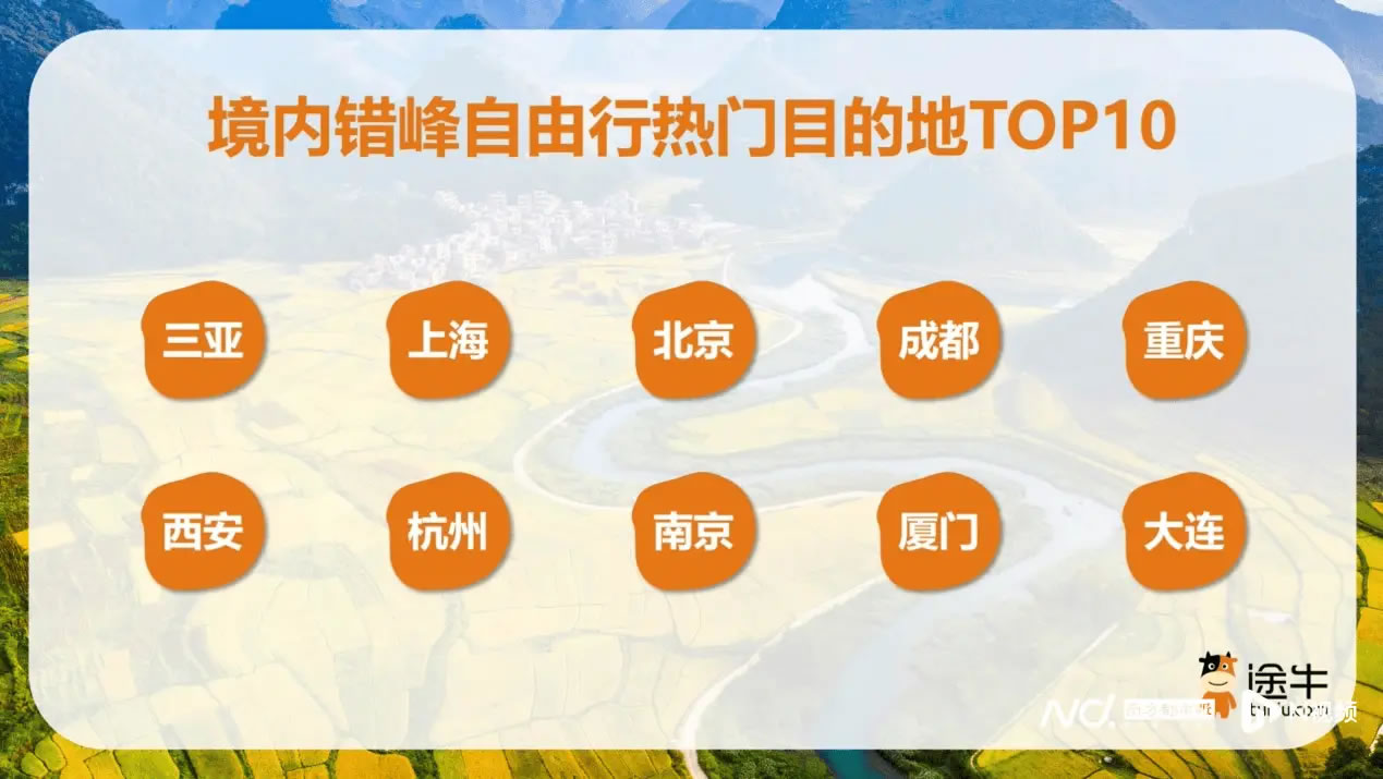 境內(nèi)錯峰游仍是多數(shù)游客的首選,途牛平臺上境內(nèi)出游人次占比超過70%。熱門目的地包括上海、北京、三亞、成都、廣州、杭州、西安、南京、重慶、黃山等地。