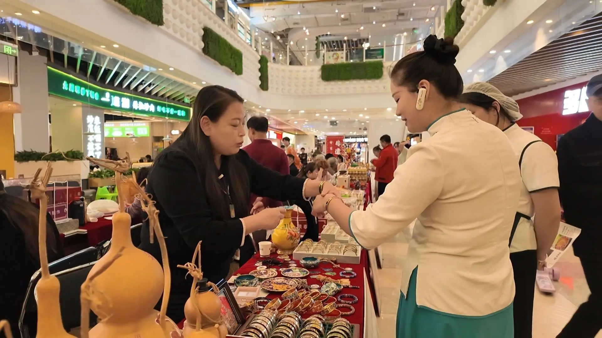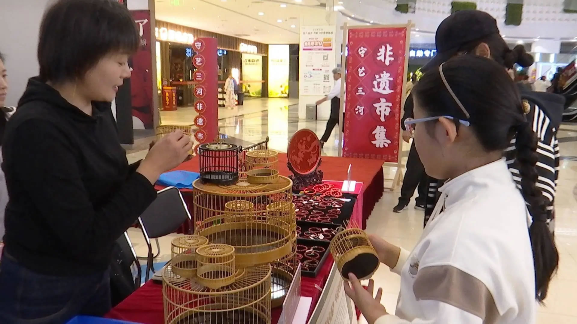 在三河喬鳥籠的攤位前,非遺傳承人正耐心地為一位小朋友講解鳥籠的制作奧秘,從選料到打磨,再到微小部件的精密組裝,精湛的技藝讓充滿好奇的孩子驚嘆不已。與此同時(shí),在商場一樓的“守藝三河”非遺精品展示區(qū),包括鼻煙壺、三河喬鳥籠在內(nèi)的多項(xiàng)非遺產(chǎn)品,吸引著往來顧客的目光。