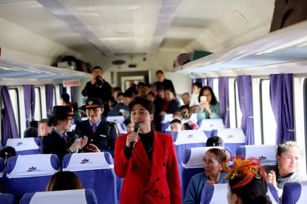 火車上,《和田是個好地方》《新疆姑娘》《祝福祖國亞克西》等經(jīng)典文藝節(jié)目輪番上演,悠揚的旋律和深情的演唱打動著在場的每一位旅客,讓車廂成為流動的舞臺。文藝表演結(jié)束后,文旅資源宣傳推介環(huán)節(jié)緊隨其后,工作人員通過生動講解與展示,帶領(lǐng)旅客提前領(lǐng)略和田的獨特風光與人文魅力。此外,宣講人員還用接地氣的家常話、互動感十足的小問答,把理論知識講得鮮活有趣,讓旅客們在旅途的碎片時光里,既能放松休憩,又能輕松收獲思想啟迪,讓出行多了一份別樣的“精神補給”。