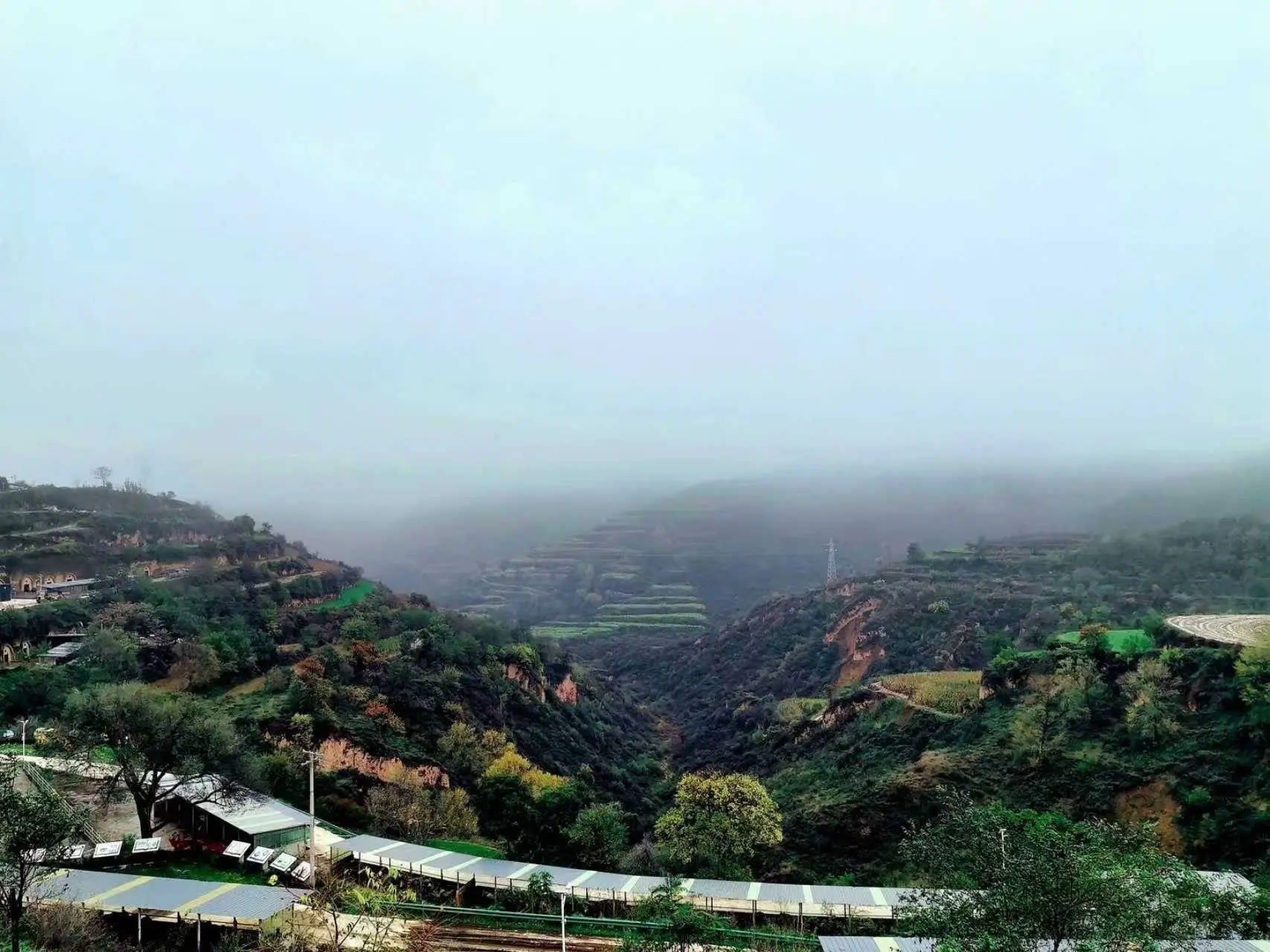 大寨鄉(xiāng)海拔1540米、北緯35.38度,屬溫帶半干旱氣候,四季分明、風景宜人,豐富的水資源和廣袤的植被共同構(gòu)筑了獨特的局部小氣候,使得大寨鄉(xiāng)在降雨之后,常常云霧繚繞。如紗的霧氣縈繞于山巒溝壑之間,將遠山近樹渲染成一幅流動的水墨畫。