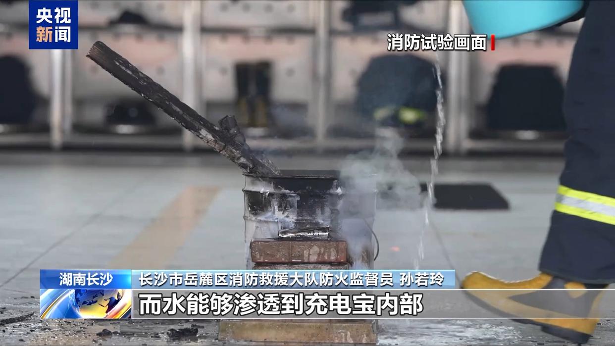 長沙市岳麓區(qū)消防救援大隊防火監(jiān)督員 孫若玲:干粉滅火器的滲透性和降溫效果比較差,在應對充電寶著火時效果并不理想,而水能夠滲透到充電寶內(nèi)部,有效滅火并起到降溫作用。