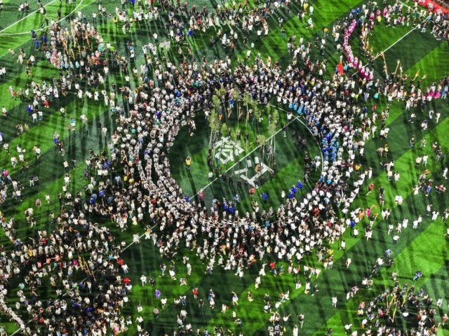 8月23日,人們在貴州“村超”球場跳苗族蘆笙舞(無人機照片)。新華社記者楊文斌 攝