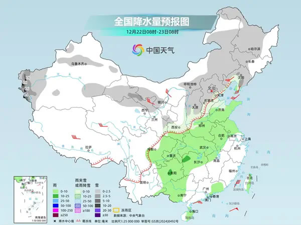 今天,西南到黃淮一帶以雨為主,華北到東北有大范圍小雪;