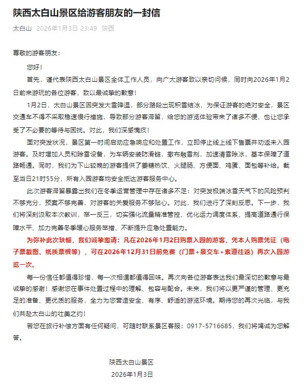 1月3日,陜西太白山景區(qū)發(fā)布給游客朋友的一封信稱,1月2日,太白山景區(qū)因突發(fā)大雪降溫,部分路段出現(xiàn)積雪結(jié)冰,為保證游客的絕對安全,景區(qū)交通車不得不采取穩(wěn)速慢行措施,導(dǎo)致部分游客滯留,對此深感愧疚。面對突發(fā)狀況,景區(qū)第一時間啟動應(yīng)急響應(yīng)和處置工作,立即停止線上線下售票并勸返未入園游客。截至當(dāng)日21時55分,所有入園游客均安全抵達游客服務(wù)中心。凡在2026年1月2日購票入園的游客,憑本人購票憑證(電子票截圖、紙質(zhì)票根等),可在2026年12月31日前免費(門票+景交車+索道往返)再次入園游覽一次。
