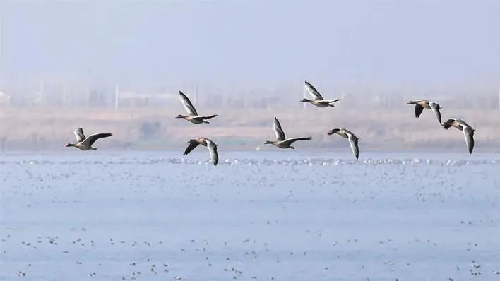 在沉湖濕地自由飛行的灰雁小分隊 通訊員顏軍攝