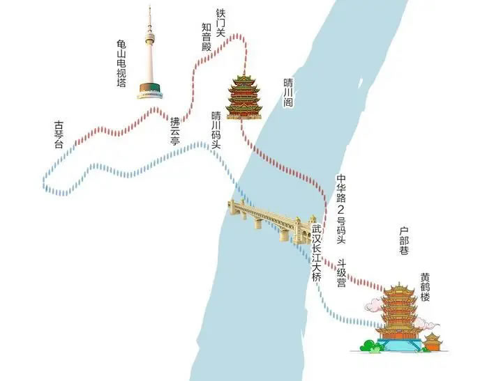 游線從蛇山黃鶴樓出發(fā),經(jīng)斗級營歷史街區(qū)、戶部巷美食區(qū),再乘坐輪渡橫渡長江,途中可觀賞長江大橋及兩岸風(fēng)光,抵達漢陽后游覽晴川燈會,最終探訪龜山知音殿與古琴臺。線路雖短,卻集中展現(xiàn)武漢“半城山水半城詩”的城市意象。