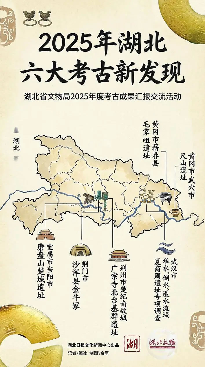2月3日,在湖北省文物局舉辦的2025年度湖北省考古成果匯報(bào)交流活動上,正式公布了2025年湖北六大考古新發(fā)現(xiàn)。分別為:黃岡市武穴市尺山遺址、黃岡市蘄春縣毛家咀遺址、宜昌市當(dāng)陽市磨盤山楚城遺址、荊州市楚紀(jì)南故城廣宗寺北臺基群遺址、荊門市沙洋縣金牛冢及武漢市舉水、倒水、灄水流域夏商周遺址專項(xiàng)調(diào)查。