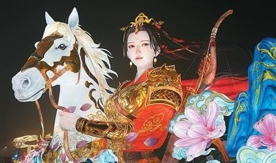 敘事主題的豐富,讓彩燈成為講述中國(guó)故事的載體。180米長(zhǎng)的《木蘭傳奇》燈組步道上,花木蘭的颯爽英姿與家國(guó)大義徐徐鋪展,傳統(tǒng)人物的精神內(nèi)核在現(xiàn)代光影技藝演繹下直抵人心。抬眼望去,全長(zhǎng)210米、高達(dá)32米的鯤鵬燈組震撼全場(chǎng),“鯤鵬展翅”的視覺(jué)奇觀與當(dāng)代載人航天、深潛等場(chǎng)景光影交融。福祿廣場(chǎng),藻井如蓮花般旋轉(zhuǎn),光影“福”字“從天而降”落入游客掌心,讓“伸手接福”從“吉祥話”變成可觸碰的溫暖記憶。