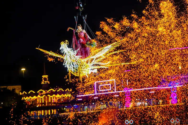 重慶歡樂谷舉行了新春大妙會活動,集水陸空立體非遺大秀、百場非遺演藝、多種民俗互動、年味萬福市集等于一體,以傳統(tǒng)與現(xiàn)代碰撞的獨特魅力為游客奉上沉浸式的地道年味體驗。其中,非遺大秀在夜幕中璀璨亮相,1600℃的鐵水揮灑成漫天花火,演員化身“天女”撒下花瓣雨,湖面的龍船、火鳳凰、風火輪等裝置火光綻放,光影成趣,水陸空一體聯(lián)動,驚艷絕倫;川劇變臉、潮汕英歌舞、福建游神、電音三太子等百場非遺演藝,讓游客可一站式領略全國傳統(tǒng)文化魅力,吸引絡繹不絕的游客前往。