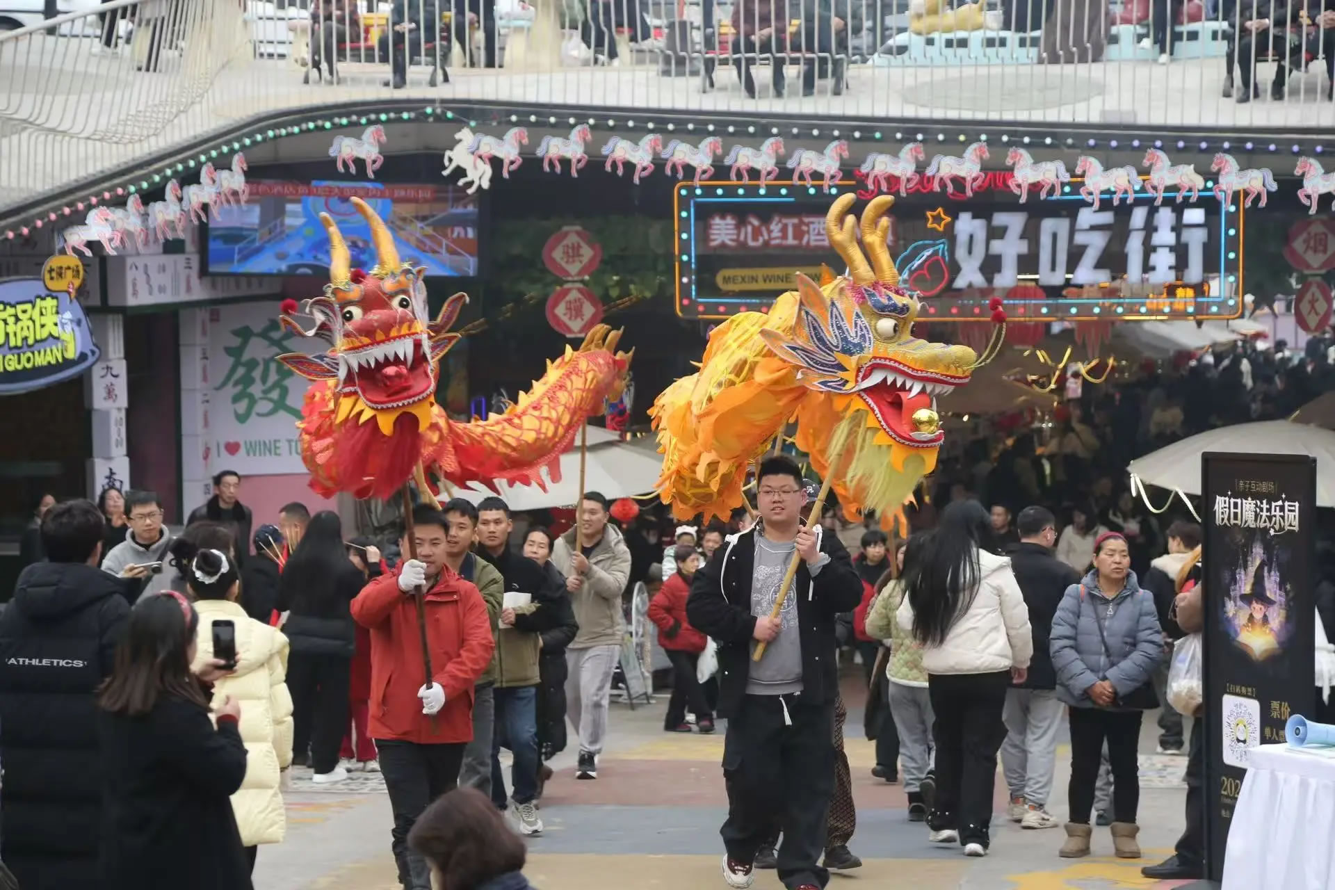 涪陵美心紅酒小鎮(zhèn)景區(qū)更是打破傳統(tǒng)景區(qū)“臺上表演、臺下觀看”的模式,全面轉(zhuǎn)向以游客為主導,全民參與、沉浸式互動的新春玩法,把游客真正“寵”進濃濃年味里。除了舞龍舞獅、民俗巡游、財神送福等經(jīng)典項目外,游客還可以穿戲服、持龍具、跟著鼓點一起巡游,親身感受傳統(tǒng)年俗的熱鬧與儀式感,從“圍觀者”變身“參與者”,讓年味更足、歡樂加倍。15日至17日,景區(qū)人氣持續(xù)火爆,日均接待游客超6萬人次,成為重慶近郊新春出游的熱門之選。