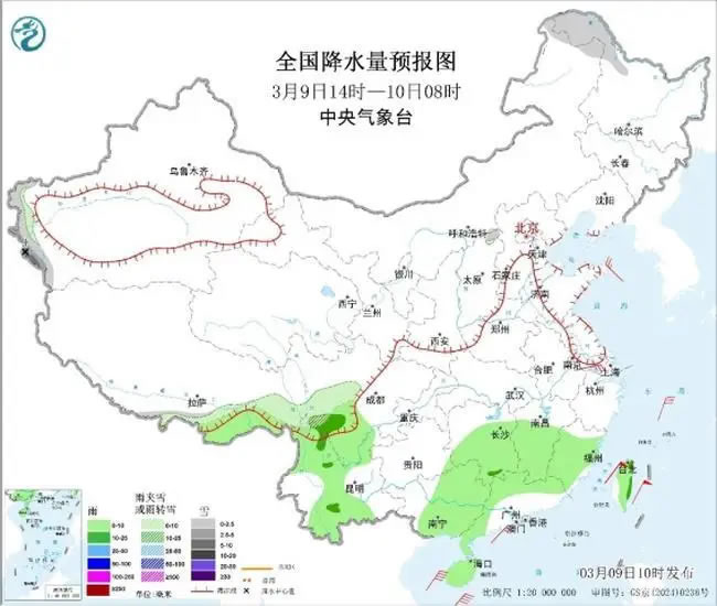 圖1全國降水量預報圖 (3月9日14時-10日08時)