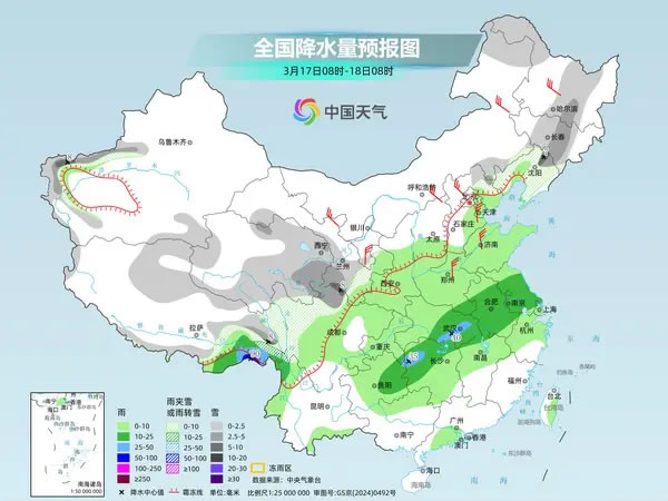 今起三天,南方仍多陰雨,西南地區(qū)東部、江淮、江南西部和北部以穩(wěn)定性降水為主,會有春雨綿綿的感覺。中央氣象臺預計,今天,新疆南部、西藏大部、青海大部、甘肅南部、寧夏南部、川西高原西部和北部等地部分地區(qū)有小到中雪或雨夾雪,其中,新疆西南部、西藏東北部和南部、青海東部、甘肅南部等地部分地區(qū)有大到暴雪。西藏東南部、湖北東部和中南部、安徽南部、湖南北部、江西西北部、重慶東南部、貴州南部和東北部、云南西北部等地部分地區(qū)有中到大雨,其中,西藏東南部等地局地有暴雨。