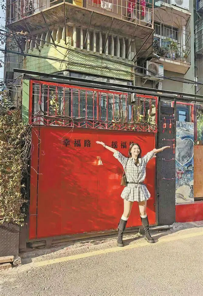 游客打卡幸福路并留下美照。(本報記者楊霞瑜 攝)