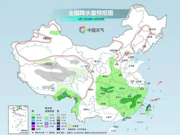 4月7日,西藏北部、青海中南部等地部分地區(qū)有小雪或雨夾雪。西藏東南部、四川盆地東北部、重慶中部、湖北西南部、湖南東部、江西中部、浙江南部、福建西部、臺灣島等地部分地區(qū)有中到大雨,其中,臺灣島西北部等地部分地區(qū)有暴雨。