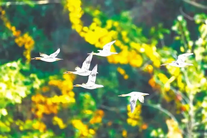 國家一級保護野生動物中華秋沙鴨已連續(xù)12年來遠(yuǎn)安越冬。 (遠(yuǎn)安沮河國家濕地公園管理處供圖)