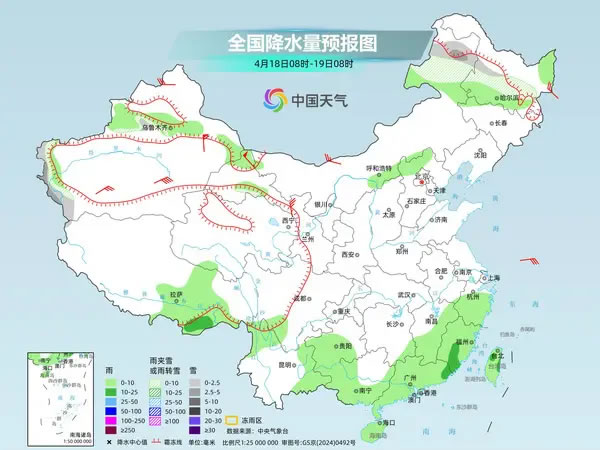 明天,內蒙古東北部、黑龍江中部、新疆南疆西部山區(qū)等地部分地區(qū)有小到中雪或雨夾雪;江南中東部和南部、西南地區(qū)南部、華南大部、臺灣島等地部分地區(qū)有小雨,局地中雨。