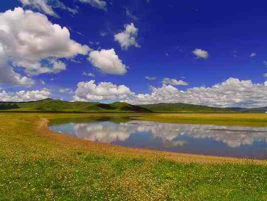 金銀灘的黃金季節(jié)是7、8、9三個(gè)月,鮮花盛開,百鳥飛翔,尤其是百靈鳥兒的歌聲,動(dòng)聽迷人。這里是一片碧草如茵的大草原。浮云般的羊群,棕黑相間的牦牛,星星點(diǎn)點(diǎn)地徜徉在青草和野花叢中。穿著藏服的藏民,騎著駿馬悠然地在草原上緩緩而來。遠(yuǎn)處,山巒起伏,偶有雄鷹飛過的身影,蓮花般的蒙古包散落在白云深處。金銀灘草原牧草肥美、牛羊肥壯,人們以金銀遍地來形容這片美麗而富饒的土地,故得名“金銀灘”。