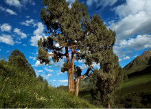 祁連圓柏為常綠喬木。是青藏高原氣候驟變時期產(chǎn)生的樹種,是名副其實的常青樹。其葉在幼樹上全為刺形,隨著樹齡的增長刺形葉逐漸被鱗形葉代替,廣泛分布于海拔2600 -4300米的陽坡、半陽坡地帶,耐寒旱、耐貧瘠,對土壤要求不高,能生于酸性、中性及石灰質(zhì)土壤上,其枝葉會散發(fā)出獨特的清香,具有清神醒腦的功效。因其根系發(fā)達,有良好的保水固土和涵養(yǎng)水源的作用,固為祁連地區(qū)主要的造林樹種和草原牧護林。以葉入藥,性苦,有止血、鎮(zhèn)咳功效。