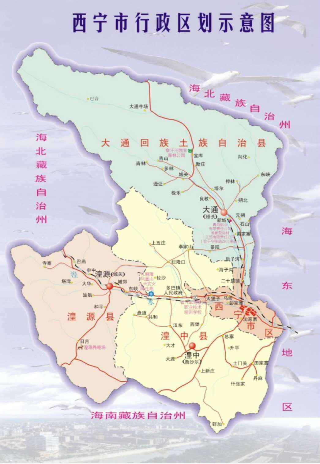 大通回族土族自治縣 面積3090平方千米,人口403368,政府駐橋頭鎮(zhèn),下轄9個鎮(zhèn)、11個鄉(xiāng)