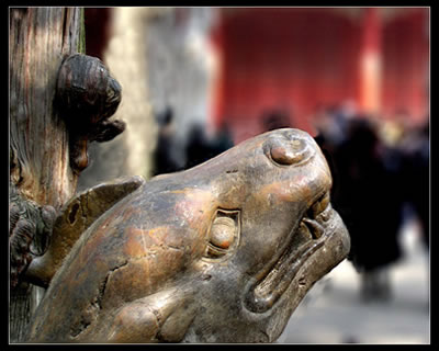 北出曲阜城門,就見兩行倉檜翠柏,如龍如虬,夾道而立,這就是孔林神道。道中巍然屹立著一座萬古長(zhǎng)春坊。這是一座六楹精雕的石坊,其支撐的6根石柱上,兩面蹲踞著12個(gè)神態(tài)不同的石獅子。坊中的“萬古長(zhǎng)春”四字,為明萬歷二十二年(公元1594年)初建時(shí)所刻,清雍正年間卻又在坊上刻了“清雍正十年七月奉敕重修”的字樣。石坊上雕有盤龍、舞鳳、麒麟、駿馬、斑鹿、團(tuán)花、祥云等,中雕二龍戲珠,旁陪丹鳳朝陽紋飾,整個(gè)石坊氣勢(shì)宏偉,造型優(yōu)美。