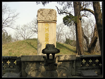 享殿之后是孔林的中心所在--孔子墓。此墓似一隆起的馬背,稱馬鬣封。墓周環(huán)以紅色垣墻,周長(zhǎng)里許。墓前有巨墓篆刻“大成至圣文宣王墓”,是明正統(tǒng)八年(公元1443年)黃養(yǎng)正書。墓前的石臺(tái),初為漢修,唐時(shí)改為泰山運(yùn)來的封禪石筑砌,清