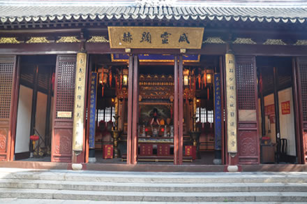 上海城隍廟,位于上海市黃浦區(qū)方浜中路249號(hào),坐北朝向南,內(nèi)部有大門、二門、戲樓、大殿、寢宮、東西廊廡,沿中軸線依次排列,總面積約三千余平方米。廟內(nèi)主體建筑有大殿、元辰殿、父母殿、關(guān)圣殿、文昌殿等9個(gè)殿堂,總面積約三千余平方米。大殿、中殿改為鋼筋混凝土結(jié)構(gòu)。大殿高16米,寬13.7米,進(jìn)深21米。歇山頂,彩椽畫棟,翠瓦朱檐,華麗輝煌。大殿前有照壁、牌坊、戲臺(tái)、碑亭。大殿祀霍光,中殿祀秦裕伯,兩側(cè)花廳奉城隍父母,后殿奉城隍夫人,樓上為寢宮。
