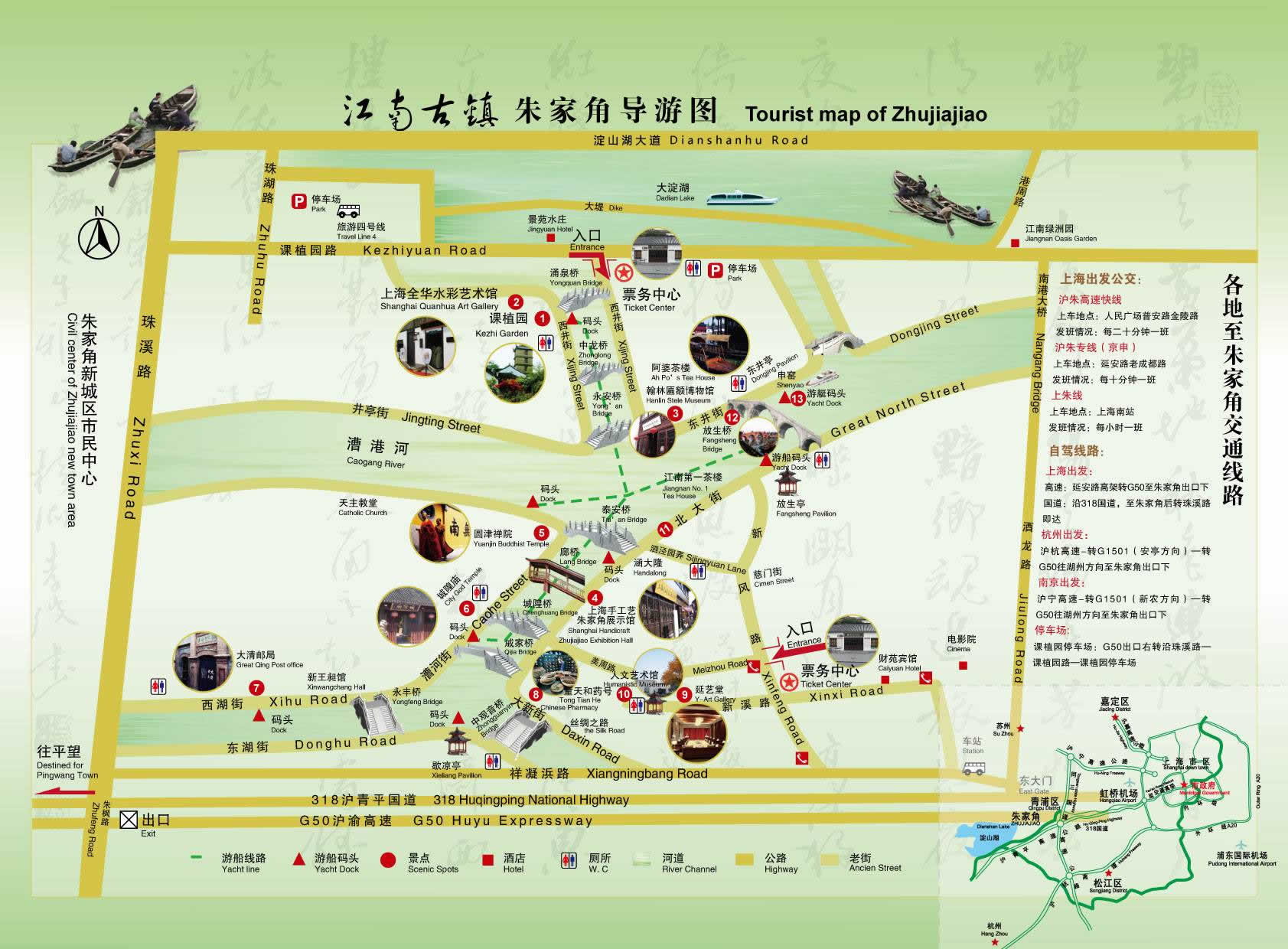 朱家角古鎮(zhèn)旅游區(qū)地處江、浙、滬二省一市交通要樞,地理位置十分優(yōu)越,東靠虹橋國(guó)際機(jī)場(chǎng),北連昆山,南接嘉興,西通平望,淀山湖下游、黃金水道漕港河穿鎮(zhèn)而過。鎮(zhèn)內(nèi)河港縱橫,九條長(zhǎng)街沿河而伸,千棟明清建筑依水而立,36座石橋古風(fēng)猶存,名勝古跡比比皆是。在玩膩了一個(gè)個(gè)雷同價(jià)高的人造景觀后,人們莫不驚訝于上海市郊還有一塊保存得如此完好的原汁原味、真山真水的天然景觀,在這里可以尋找一種回歸自然,崇尚野趣的享受。無怪乎一位同濟(jì)大學(xué)的名教授在考察朱家角古鎮(zhèn)旅游區(qū)后,不覺贊嘆:“朱家角古鎮(zhèn)旅游區(qū)有這么豐富的文化遺產(chǎn),不僅是上海一寶,也是國(guó)家的瑰寶”。臺(tái)灣著名已故作家三毛,到此曾為“小橋、流水、人家”的格局而迷戀,為清淳幽靜,處處可畫、時(shí)時(shí)有詩(shī)的風(fēng)情而陶醉。中共中央政治局委員、國(guó)務(wù)院副總理吳邦國(guó)在視察了古鎮(zhèn)朱家角古鎮(zhèn)旅游區(qū)后,不禁欣然命筆,寫下了“全國(guó)歷史名鎮(zhèn)朱家角古鎮(zhèn)旅游區(qū)”幾個(gè)大字。