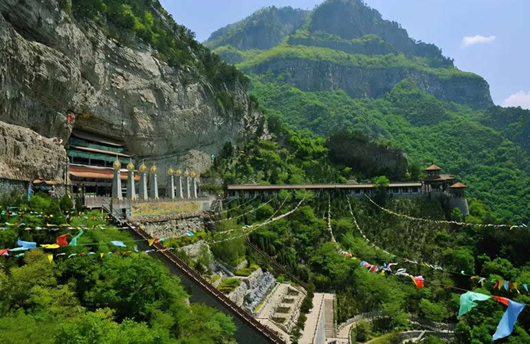 天橋是因修筑在懸崖絕壁上的棧道而得名,有千余年的歷史。長300余米,寬 1 米多,上離峰頂80余米,高入云表;下距溝底300余米,懸于危巖上。每逢雨過云涌,人在橋上過,云在腳下飛,使人有平步青云,飄飄欲仙之感。景區(qū)內(nèi)主要建筑是洞神宮、祖師殿、七真殿、水母殿、懸空長廊等和回頭看柏龍、兔橋、須彌石等名勝景觀。有孔明和張良等人的修行洞。此外還有中國古代最險絕的軍事堡壘——石勒寨,地勢險峻,易守難攻。