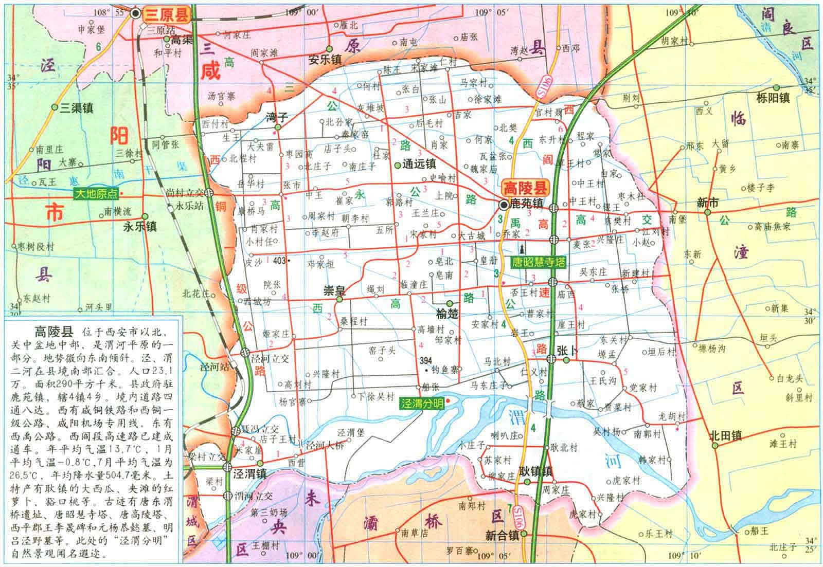 高陵縣地處陜西省關(guān)中平原腹地,位于西安市轄域北部。全縣轄4鎮(zhèn)4鄉(xiāng),88個行政村,740個村民小組?偯娣e294平方公里,每平方公里人口密度約950人??cè)丝?8萬人,其中非農(nóng)業(yè)人口11.9萬。