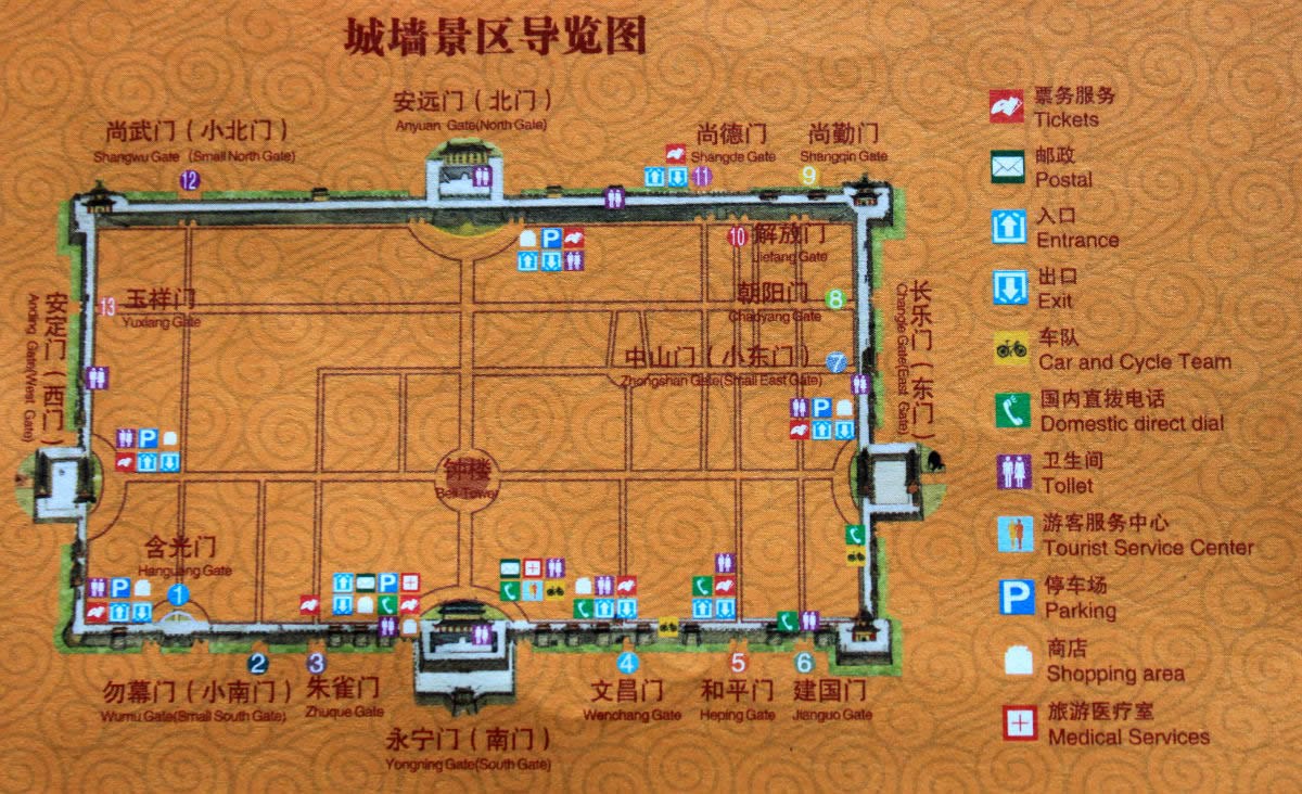 西安城墻現(xiàn)有城門(mén)18座,從永寧門(mén)開(kāi)始順時(shí)針依次為:永寧門(mén)、朱雀門(mén)、勿幕門(mén)、含光門(mén)、安定門(mén)、玉祥門(mén)、尚武門(mén)、安遠(yuǎn)門(mén)、尚德門(mén)、解放門(mén)、尚儉門(mén)、尚勤門(mén)、朝陽(yáng)門(mén)、中山門(mén)、長(zhǎng)樂(lè)門(mén)、建國(guó)門(mén)、和平門(mén)、文昌門(mén)。這18座城門(mén)的形成時(shí)間和規(guī)格各不相同。