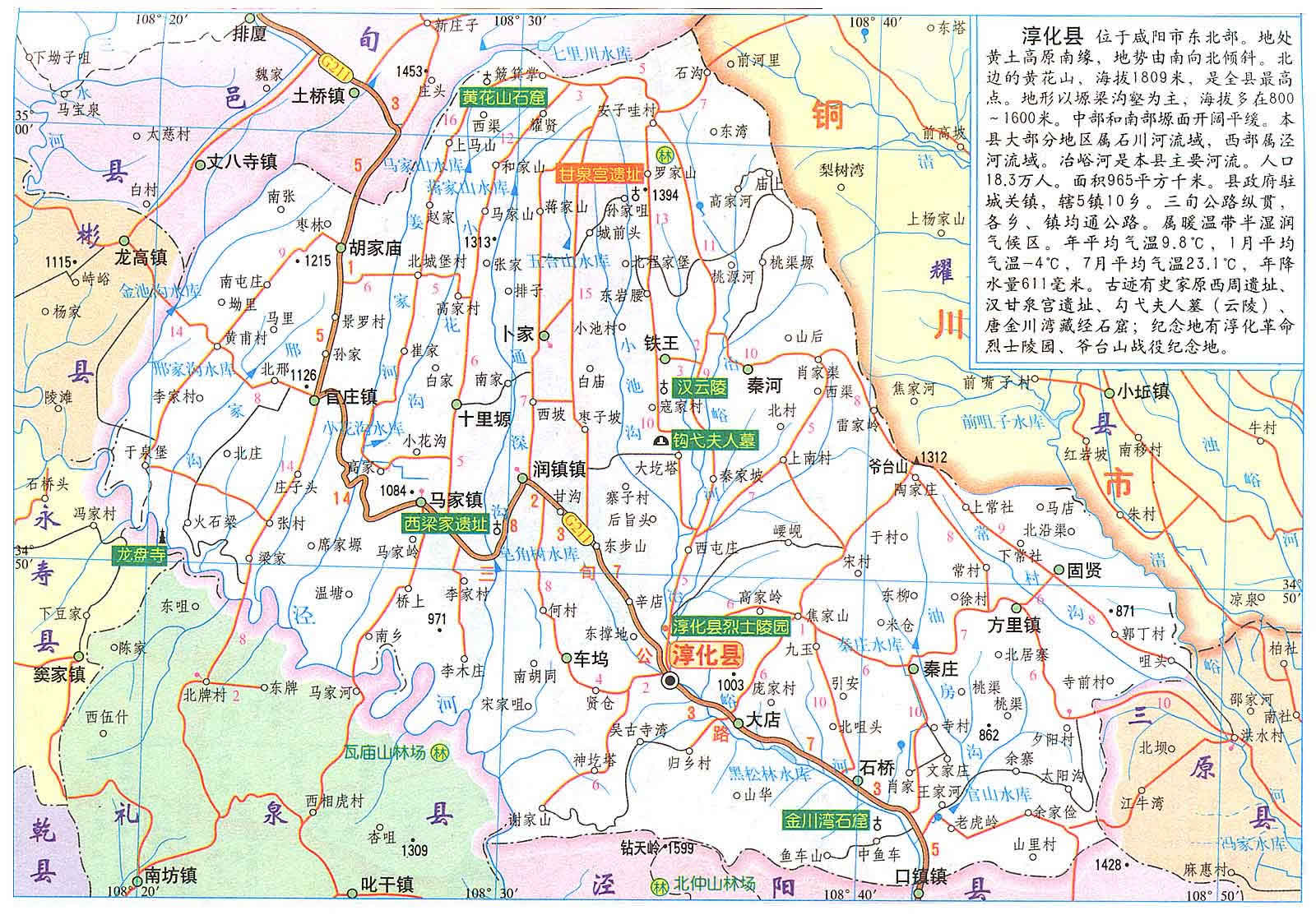 淳化縣以北宋太宗淳化年號而名。淳化縣位于三秦之腹,涇水之陽,南接北仲、嵯峨二山,北枕子午嶺余脈甘泉山(今黃花山),東依爺臺山,西鄰金池水。山圍水繞,盆抱而聚。冶峪蜿蜓貫其腹,涇水滔滔繞西南。是一個典型的山區(qū)農(nóng)業(yè)縣、革命老區(qū)縣和國家新一輪扶貧開發(fā)重點縣。全縣總面積983.81平方公里,耕地面積54萬畝,轄5鎮(zhèn)10鄉(xiāng)204個行政村,總?cè)丝?0.54萬人,其中農(nóng)業(yè)人口17.53萬人。境內(nèi)地勢北高南低,海拔630—1808.9米,地貌可概括為”一丘一山三溝五塬”。生態(tài)環(huán)境優(yōu)越,林草資源豐富,先后被評為“陜西省綠化模范縣”和“全國綠化模范縣”。傳統(tǒng)文化積淀深厚,民俗民風淳樸,文物古跡眾多,秦直道、秦林光宮、漢甘泉宮、唐“三階教”石窟遺風猶存。革命戰(zhàn)爭時期是陜甘寧邊區(qū)的南大門,鄧小平、劉志丹、習仲勛等老一輩無產(chǎn)階級革命曾在這里生活、戰(zhàn)斗過,震驚中外的爺臺山戰(zhàn)役就發(fā)生在這里。
