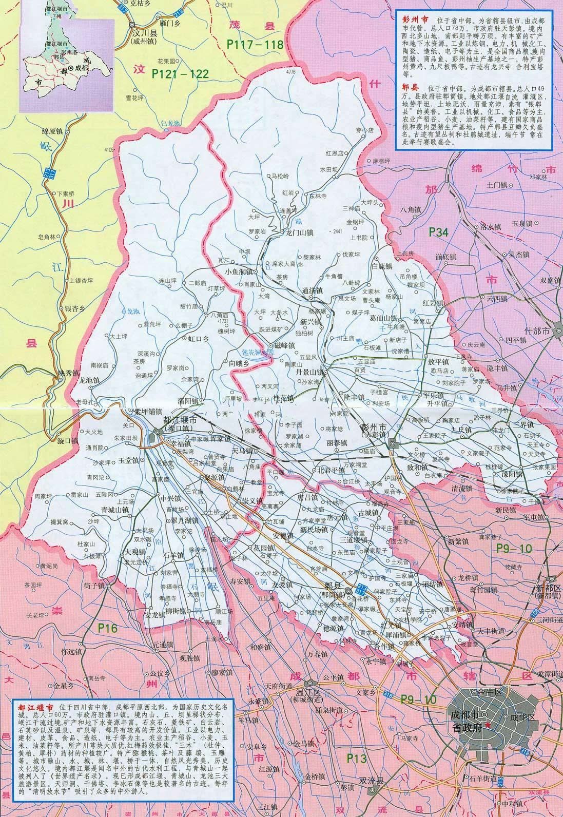 彭州市位于四川省會成都西北部,距成都市區(qū)25公里,人口78萬,面積1420平方公里,是成都市人口第三,面積第二的小康市。彭州是古蜀國建都立業(yè)的核心地區(qū),自秦漢以來,建縣設(shè)郡達2000多年,有著悠久的歷史文明,素有“天府金盆”、“蜀漢名區(qū)”之美譽。
