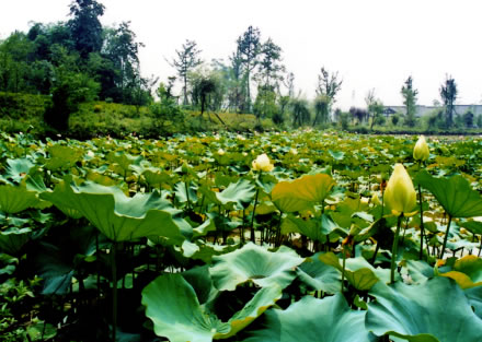 潭內(nèi)種植有許多觀賞荷花,初夏時(shí)節(jié),碧荷連天、綠滿大地、蓮花朵朵,香飄滿園。輕風(fēng)吹過,花兒嬌羞欲語、隨風(fēng)起舞、揺曵生姿,為這寧靜的湖光山色憑添了許多的生機(jī)和靈氣。由此讓我們不禁想到周敦頤的《愛蓮說》:“蓮,花之君子者也!薄俺鲇倌喽蝗,濯清漣而不妖,中通外直,不蔓不枝,香遠(yuǎn)益清,亭亭靜植,可遠(yuǎn)觀而不可褻玩焉!
