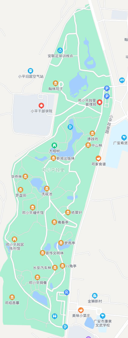 2004年8月,成立鄧小平紀(jì)念館;同年12月,更名為鄧小平故里管理局,負(fù)責(zé)管理和保護(hù)鄧小平故里紀(jì)念園區(qū)和佛手山風(fēng)景區(qū)。鄧小平故里現(xiàn)有全國重點(diǎn)文物保護(hù)單位6處,以及民俗民風(fēng)等自然景觀多處。園內(nèi)按文物維修原則修繕了鄧小平故居、蠶房院子、翰林院子、德政坊、神道碑、放牛坪、清水塘、鄧家老井、洗硯池、鄧紹昌墓等近20處鄧小平同志青少年時(shí)期的活動(dòng)場所。