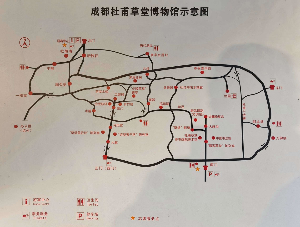 博物館按功能區(qū)分為:文物景點游覽區(qū)(草堂舊址)、園林景點游覽區(qū)(梅園)和服務(wù)區(qū)(草堂寺)。草堂舊址內(nèi),照壁、正門、大廨、詩史堂、柴門、工部祠排列在一條中軸線上,兩旁配以對稱的回廊與其它附屬建筑,其間有流水縈回,小橋勾連,竹樹掩映,顯得既莊嚴肅穆、古樸典雅而又幽深靜謐、秀麗清朗。工部祠東側(cè)是“少陵草堂”碑亭,象征著杜甫的茅屋,已成為杜甫草堂的標志性景點和成都的著名景觀。