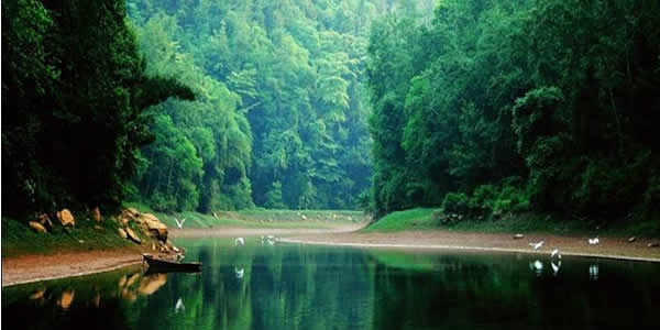 (4)象鼻河 象鼻河位于回龍湖尾段,經(jīng)岳池縣城出發(fā)車行至天平鎮(zhèn)回龍湖坐船可到,河長約四公里。因河端有一小山,形態(tài)奇特,遠望酷似大象的鼻子,所以這條河就叫象鼻河。象鼻河寬五六丈,象一顆長寶石鑲嵌在兩岸的高巖之間。象鼻河西側(cè)有雞頸坳和庵堂坡相互攀比,各自把山巖泉水盡量拋出。飛瀑直下,銀花四濺,疑是仙人,丟下白練。兩岸樹木,青翠欲滴,藤繞山石,鳥戲其間,蜂飛蝶舞,何等悠然。乘舟慢進,有山風(fēng)習(xí)習(xí),涼爽撲面。清澈河水,擁抱船板,發(fā)出咕咕細語,情意綿綿。上游涌來清流,與河水交融,握手言歡。游魚競技,爭先恐后,其樂融融,游人贊嘆。“青山之中藏小河,木船水頭蕩清波。有人興起一聲吼,魚逃鳥飛野兔躲。誰說人間無仙境?不信請來象鼻河。”象鼻河匯入的回龍湖鑲嵌在兩岸直壁芳草如茵的群山之中,這里水面遼闊,一碧如玉;湖上輕舟飛蕩,魚歌陣陣,銀鱗競躍,水鳥爭翔,陰雨時山色空 蒙,晴天里滿目蒼翠,是川東的又一西子湖。湖邊近500畝的名優(yōu)水果和各種反季節(jié)果類,更是錦上添花。