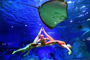 徜徉于多彩的海底世界,一覽多彩珊瑚、熱帶魚群以及兇猛的鯊魚構(gòu)成的海底世界。美麗的俄羅斯水秀演員、童話里的美人魚,搖曳身姿,共同舞動(dòng)海底深處的視覺奇跡。探訪深海的馴養(yǎng)師也將攜手兇猛鯊魚,演繹人鯊共舞。