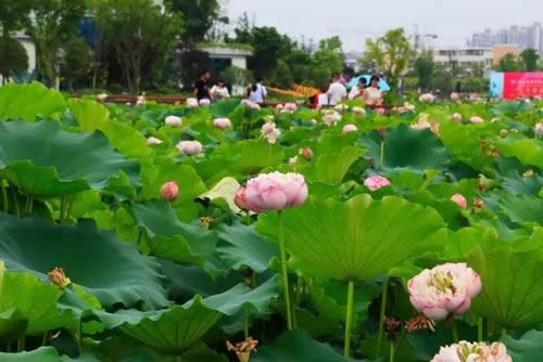 工程實行24小時全天作業(yè)。經(jīng)過緊張有序的施工建設,荷花種植面積共約619畝。計劃種植荷花約20萬株,荷花育苗工作已全面完成,絕大部分已長出嫩芽,成活率達99.9%。此外,涉水基礎(chǔ)項目水下主體已基本完工,光彩亮化項目預計6月底基本完工,市政、綠化項目的重要節(jié)點部分在7月底亮相。預計8月初向市民開放。