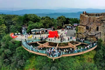 “懸空玻璃景觀平臺(tái)”位于景區(qū)的最高點(diǎn),劍門關(guān)景區(qū)大劍山主峰上,該平臺(tái)建成面高程為1163.800m,懸挑部分采用鋼結(jié)構(gòu),其鋼結(jié)構(gòu)的鋼梁采用兩種“工”字疊加組成。主景觀平臺(tái)懸空跨度25mm,平臺(tái)面層采用高強(qiáng)多層疊合玻璃鋪面,玻璃厚度約6cm,平臺(tái)距崖底高約150m,懸空玻璃觀景臺(tái)懸挑長度為世界第二、亞洲第一,僅次于美國科羅拉多大峽谷國家公園懸空玻璃觀景廊橋。橋面設(shè)計(jì)寬度為3米,橋梁凈跨約20米古樹,景觀玻璃平臺(tái)與古樹,古木石雕等相呼應(yīng),游客行走其上,可高空俯瞰體驗(yàn)劍門關(guān)景區(qū)的雄、奇、險(xiǎn)、秀。