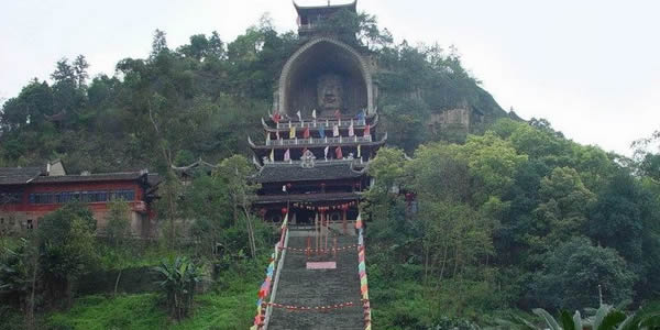 榮縣大佛:榮縣城東0.5公里有全國第二大佛——榮縣大佛,大佛寺內(nèi)半山之上,有一尊巍峨的石刻如來坐佛佛像,世稱榮縣大佛。大佛依山崖鑿成,通高36.67米,頭長8.76米,肩寬12.67米,膝高12米,腳寬3.5米,其頭部長8.76米,肩寬12.67米,腳寬3.5米。是一尊如來佛像,僅次于樂山彌勒大佛,為中國第二石刻大佛!s縣大佛開鑿于北宋元豐八年(公元1085年),完工于公元1092年,歷時八年始完工。大佛的頭頂上方有一道石條卷拱護罩,上刻“大開覺路”四字;崖頂上還有磚閣一座,遠看像在戴在大佛頭頂上的寶冠。 大佛鑿刻完工后,即修有殿宇保護,根據(jù)《古今圖書集成》記載,時有“架殿十層,高四十七丈,闊十五丈”、“舊時寺門、抵今溪岸”?梢姰(dāng)時的恢宏氣勢,其后幾毀幾修,現(xiàn)存的殿宇為清代嘉慶、道光年間所建。1988年重建的大佛護身樓,是仿木仿古重檐歇山式建筑,既保護了大佛,又具游覽價值,逐層登樓近瞻佛容慈顏,從上到下盡觀大佛偉岸雄姿,鳥瞰榮城風(fēng)貌,眺望遠山近巒。