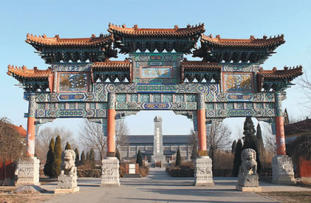 陵園坐北向南,四周為高16米的紅磚花墻。大門(mén)上方,書(shū):靜?h烈土陵園。門(mén)兩側(cè)書(shū)有"誓殲天津蔣匪壯烈犧牲"和"踏著烈士血跡勇往直前"的楹聯(lián)。