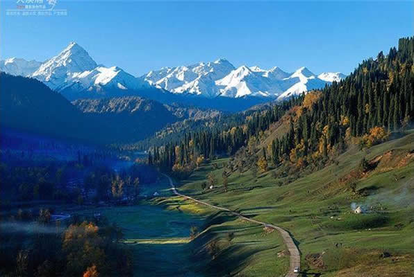在庫爾德寧闊谷向南方眺望,晴空麗之下,一座白雪皚皚,勢如劍挺,雄居群山之上的高大山峰就是喀班巴依峰?Π喟鸵婪搴04257米,是那拉提山肪最高峰,也是伊犁著名山峰之一。