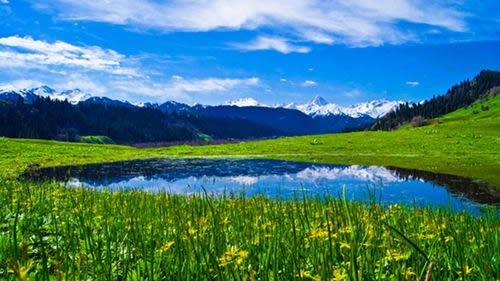從闊谷東側(cè)穿林攀山而上,眼前一望無際,遼闊美麗的草原就是頗具勝名的庫爾德寧大草原。草原上山花爛漫,牛羊蠕動,群馬奔騰,處處都是“風(fēng)吹草地見牛羊”的動人景象;山灣溪畔,密林排映之下是氈房點點,炊煙裊裊;極目遠眺,天際處,皚皚雪峰在陽光照射下,幻化出五顏六色的光芒;齊齊的林線下是郁郁蔥蔥,綿延不絕的茫茫林海;藍天上,白云朵朵,雄鷹展翅翱翔;在草原西南側(cè),鑲嵌著一面園月以的小湖,水平如鏡,清澈見底,天光云彩,湖中徘徊,詩情畫意油然而生。日暮時分,夕陽如血,霞飛滿天,光移景動,山色朦朧,群山露紅,層林盡染,更是難得的景致。庫爾德寧草原風(fēng)光無限,美麗如畫,令人目不暇接。 |
