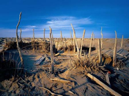 羅布泊干涸后,周圍生態(tài)環(huán)境發(fā)生巨變,草本植物全部枯死,防沙衛(wèi)士胡楊樹成片死亡,沙漠以每年3~5米的速度向羅布泊推進,很快和廣闊無垠的塔克拉瑪干沙漠融為一體。羅布泊從此成了寸草不生的地方,被稱作“死亡之!薄