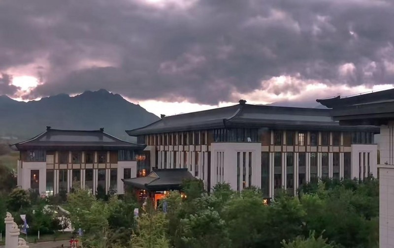 那白,不再是日光下格外耀眼的白,而是閃著被雨水調(diào)和了的,一種溫潤(rùn)如玉的光澤;那瓦,也不再是樸素的灰,而是透著水光,泛著烏亮的顏色,像巨鳥收斂的羽翼,沉靜地棲息著。松風(fēng)館靜默在青松的環(huán)抱里,雨水順著松針的尖端,凝成一顆顆晶瑩的,欲墜未墜的珠子。遠(yuǎn)遠(yuǎn)望去,太行山原本雄渾蒼勁的輪廓,在雨幕里漸漸化作宣紙上暈開的青黛,而繚繞的云霧,恰似畫家筆下有意無(wú)意的留白。此刻,唯有雨水從高處滴落,敲在石上、葉上的聲響,正應(yīng)了那句“青松凝露翠,寒色隱泉聲”的幽靜與禪意。