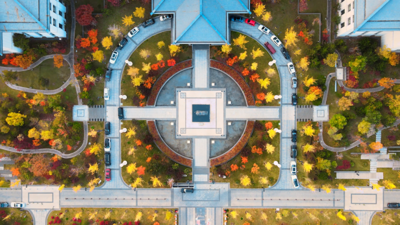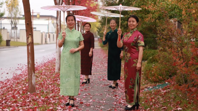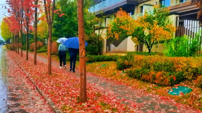 小鎮(zhèn)的雨,是天地間最奇妙的調(diào)色盤,它懂得用豐富的色彩調(diào)和季節(jié)的輪回。打濕銀杏時(shí),雨便成了金黃;灑落楓樹時(shí),雨便成了火紅;浸潤(rùn)松柏時(shí),雨又化作濃綠……長(zhǎng)街、小路被洗的油亮,早落的黃葉,粘在濕漉漉的石面上,像一枚精致的書簽,應(yīng)和著“秋雨梧桐葉落時(shí)”的意境;路上的行人并不匆忙,而是踏著雨聲的節(jié)拍,在“斜風(fēng)細(xì)雨不須歸”的悠然中,邂逅墻角那叢“菊散金風(fēng)起”的絢爛。偶有身著旗袍的女子,撐一把油紙傘,在飄落一地的紅楓葉上款款漫步。那身影穿過(guò)雨幕,恍若從水墨長(zhǎng)卷中走出的意象,在現(xiàn)實(shí)與夢(mèng)境之間翩翩起舞;雨聲里飄來(lái)山居食堂的暖香,水汽與雨霧在空中交融,織就“寒夜客來(lái)茶當(dāng)酒”的溫潤(rùn)時(shí)光。