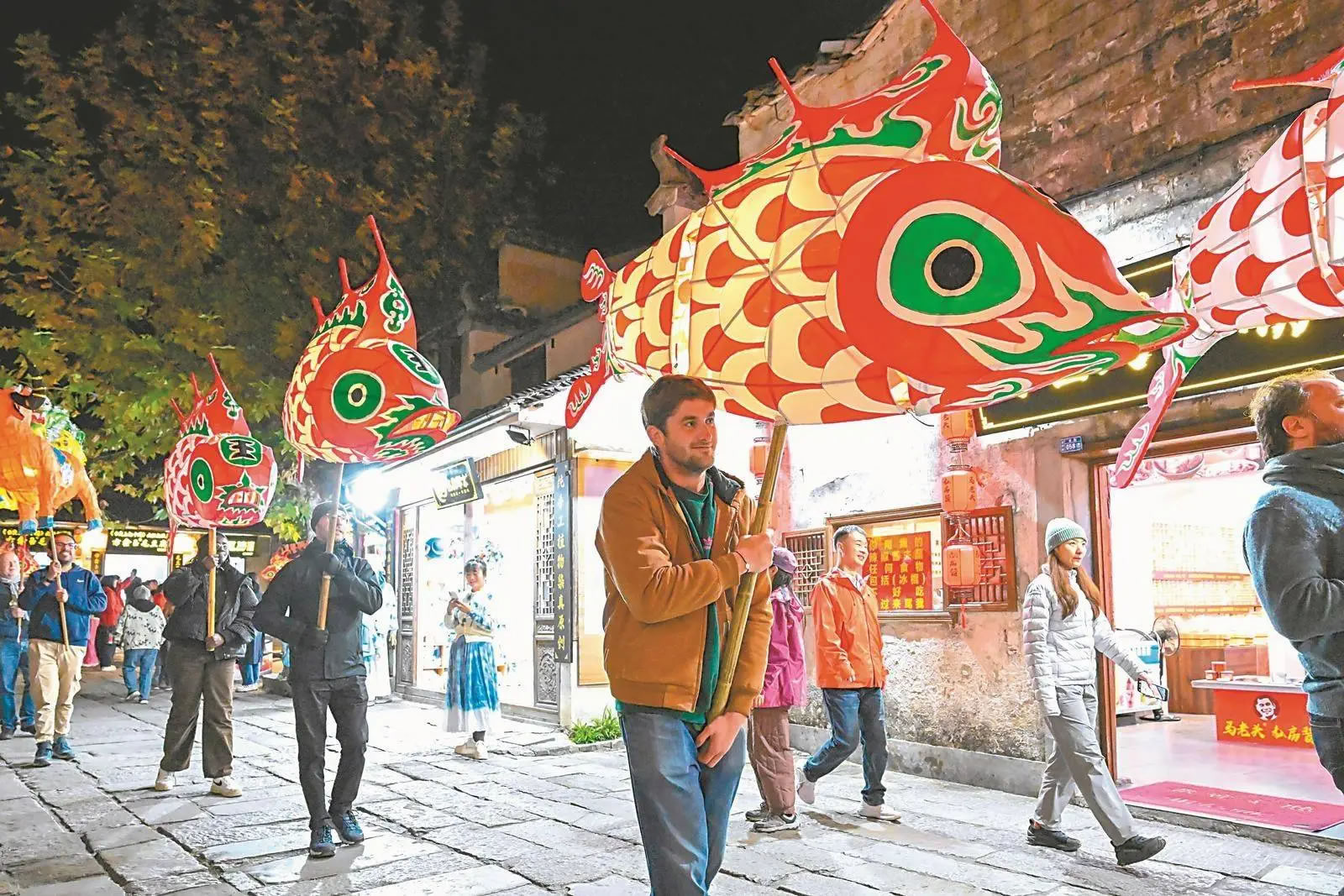 11月15日,在黟縣宏村景區(qū),外國(guó)游客在體驗(yàn)非遺魚燈表演。通訊員趙明攝